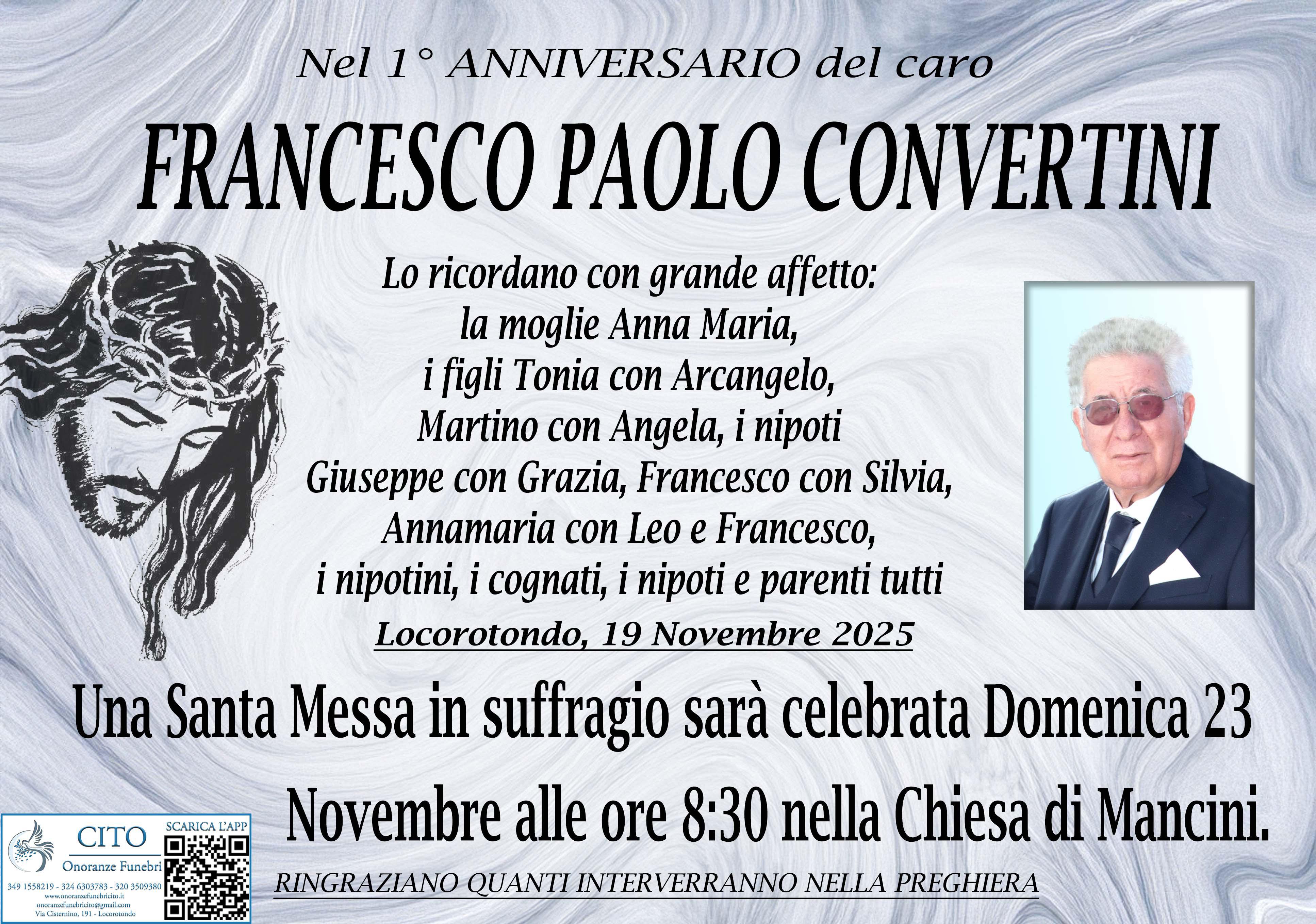 Nel suo primo anniversario, ricordiamo con grande affetto il caro Francesco Paolo con una Santa Messa in suffragio che sarà celebrata Domenica 23 Novembre alle ore 8:30 nella Chiesa di Mancini.